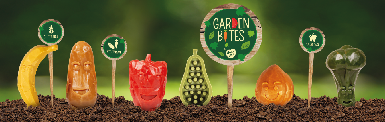 Produkty Garden Bites wyróżniają się charakterystycznymi kształtami, różnorodnością smaków oraz starannie dobranymi składnikami pochodzenia roślinnego. W ofercie znajdują się m.in. gryzaki dentystyczne, przekąski funkcyjne oraz przysmaki do codziennego stosowania, które łączą przyjemność żucia z realnymi korzyściami zdrowotnymi.